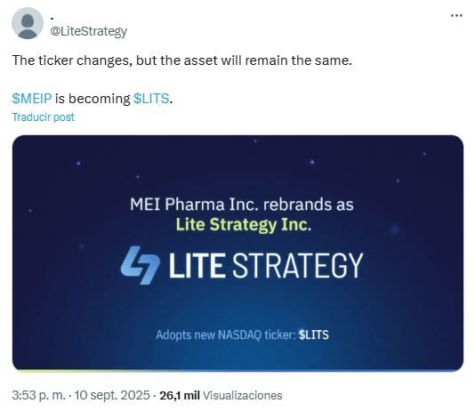 MEI Pharma avanza con su estrategia de adquisición de Litecoin, comenzando con un cambio de nombre. La compañía farmacéutica cambió su nombre a Lite Strategy, manteniendo parte de su actividad farmacéutica, según informó Cryptopolitan. El ticker MEIPS también será reemplazado por LITS.