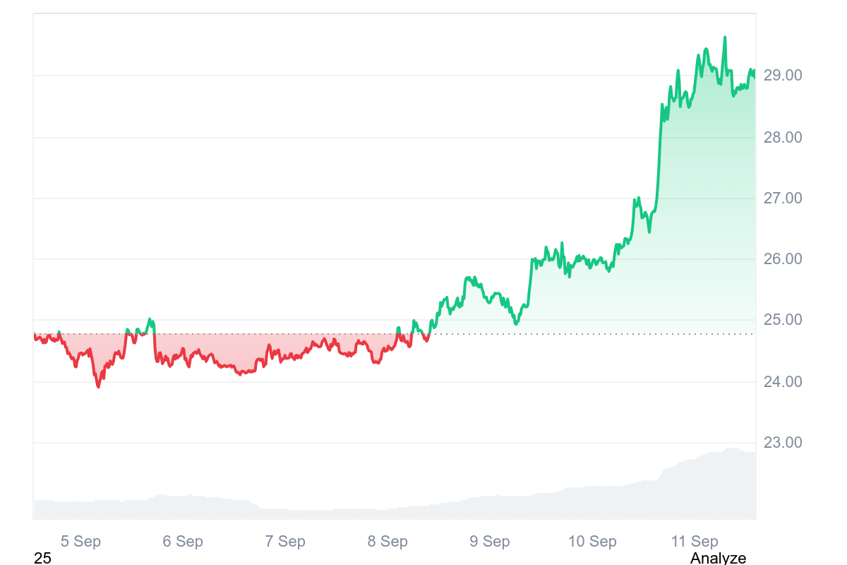 El jueves, el precio de AVAX saltó a máximos de 29,82 dólares, con un volumen diario que aumentó más del 73%.