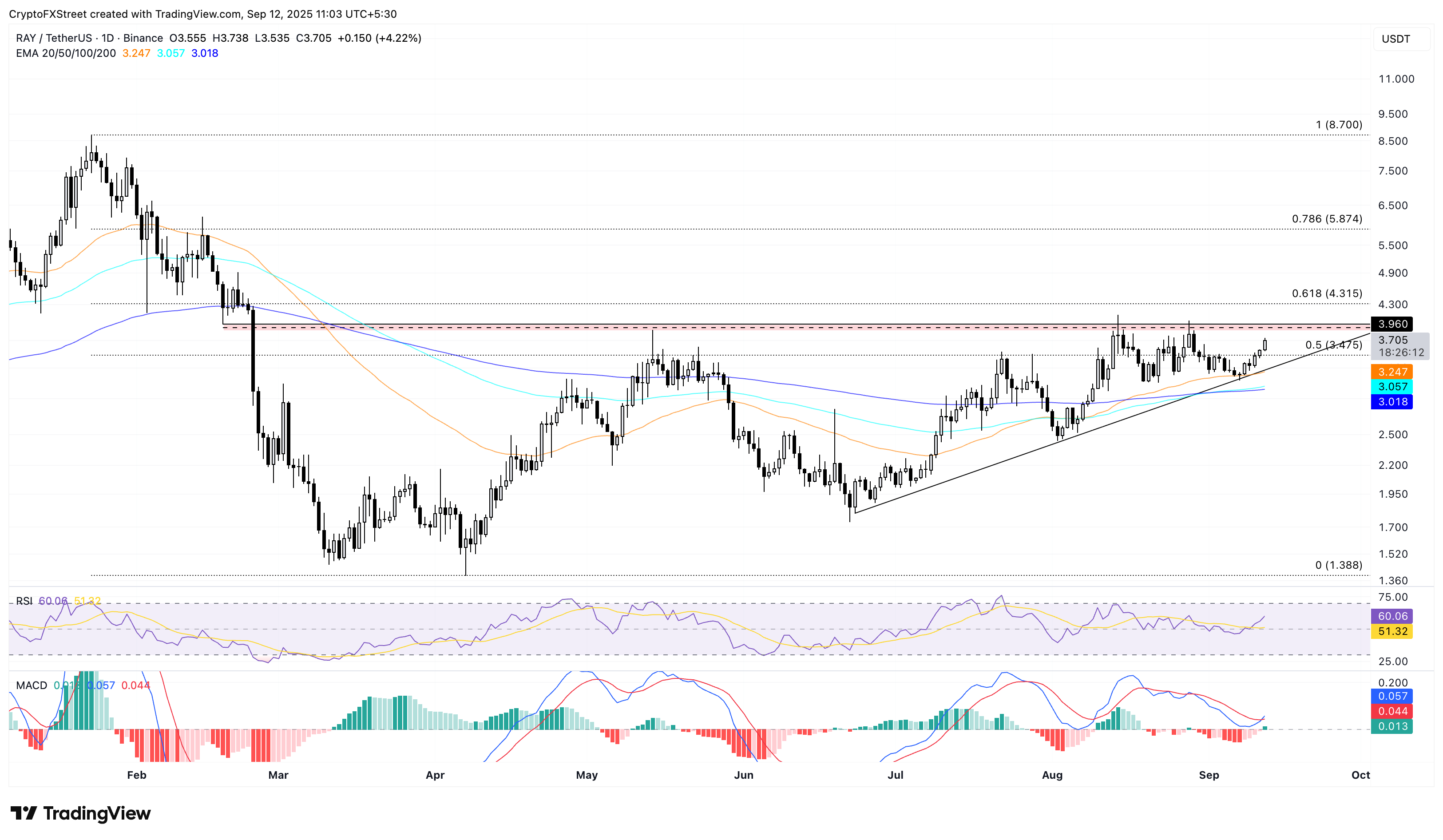Mirando hacia abajo, si RAY no logra superar los 3.960$, una posible reversión podría probar el nivel de retroceso de Fibonacci del 50% en 3.475.