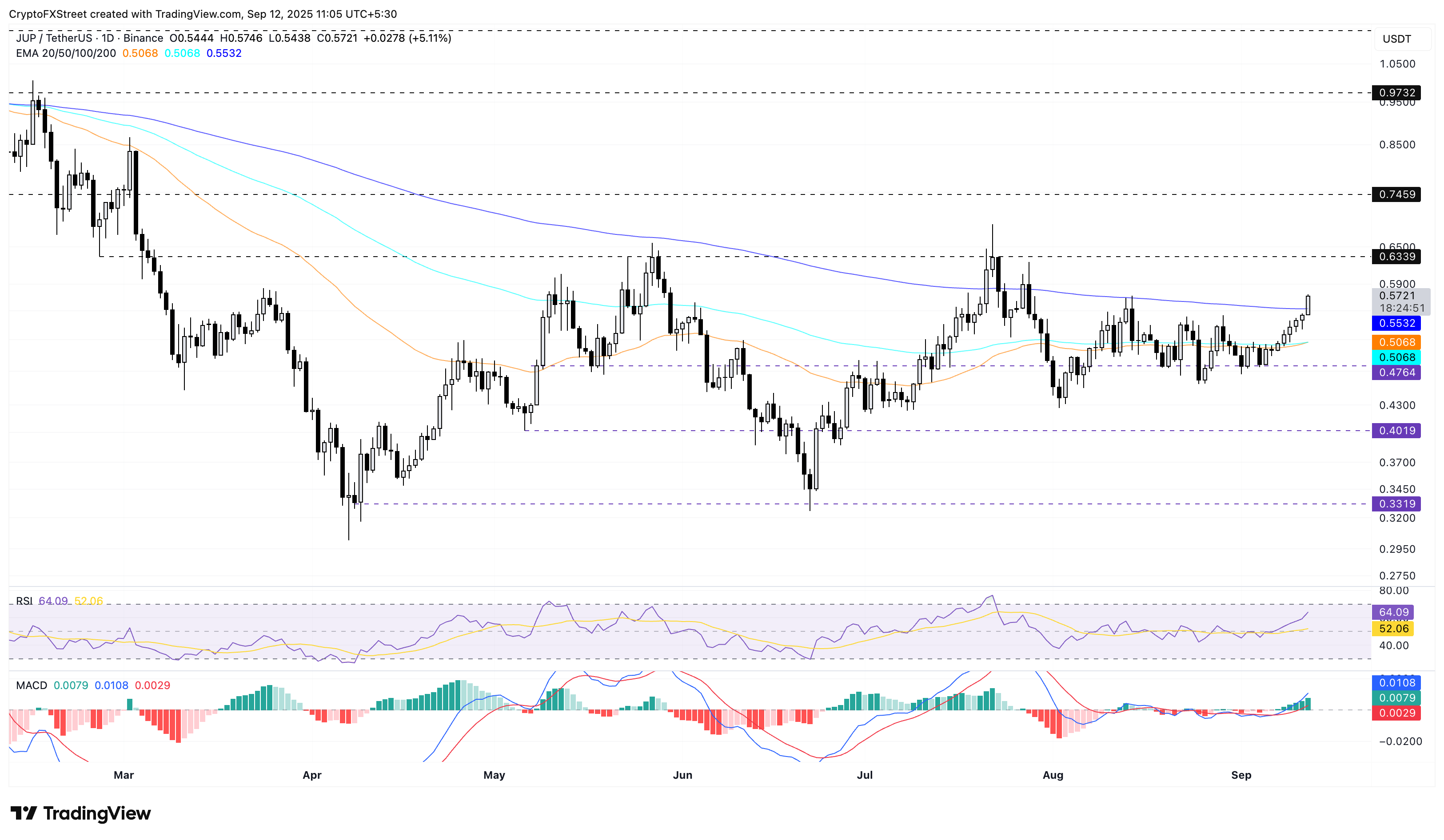 Por otro lado, Jupiter también mantiene una perspectiva alcista con un aumento del 5% en el momento de la publicación del día, marcando el sexto día consecutivo de ganancias. La recuperación supera la EMA de 200 días en 0.5532$, con los alcistas apuntando al nivel de 0.6339$, que fue probado por última vez el 23 de julio.