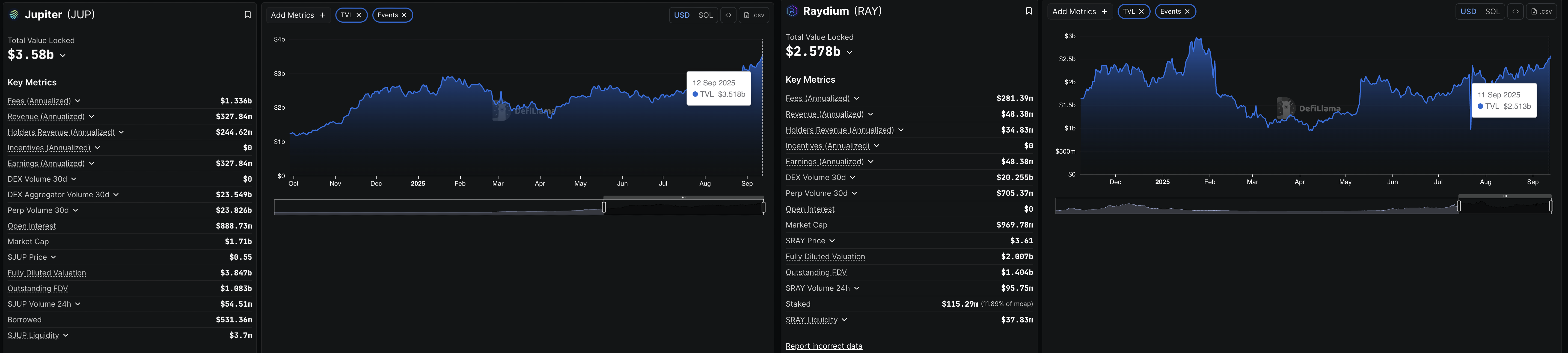 Un aumento en la demanda de los protocolos basados en Solana y el mercado de derivados indica un incremento en la demanda minorista. Los datos de DeFiLlama muestran que el Valor Total Bloqueado (TVL) en Raydium y Jupiter ha aumentado a 2.578 millones de dólares y 3.580 millones de dólares, respectivamente. Este aumento en los activos depositados en los protocolos DeFi refleja un incremento en la liquidez y el crecimiento de la red.