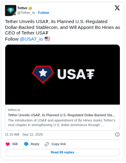 Tether anunció USAT, una nueva stablecoin respaldada por dólares adaptada a las regulaciones de Estados Unidos. Bo Hines, un exasesor cripto de la Casa Blanca, será el nuevo CEO de la subsidiaria.