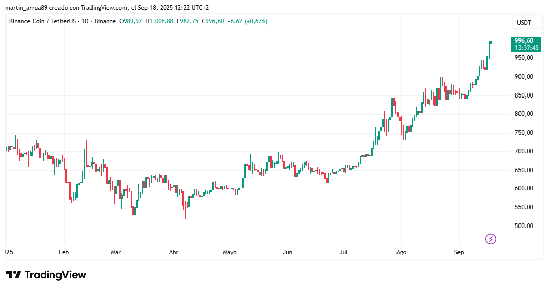 Al momento de la publicación de este artículo, BNB se negocia en 997,15 dólares, tal como se observa en el siguiente gráfico de TradingView: