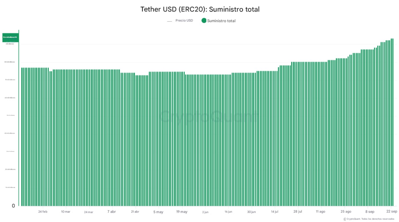 En este contexto, Tether ($USDT) mantiene el liderazgo. El suministro de $USDT en la red Ethereum (ERC-20) alcanzó los 93.400 millones de dólares, según se aprecia en los datos de CryptoQuant, cifra que refleja la acuñación de nuevos tokens y un ingreso sostenido de capital desde mediados de julio. Este flujo constante ha reforzado la liquidez en plataformas DeFi y en exchanges centralizados, consolidando el uso de $USDT como principal stablecoin en la industria.