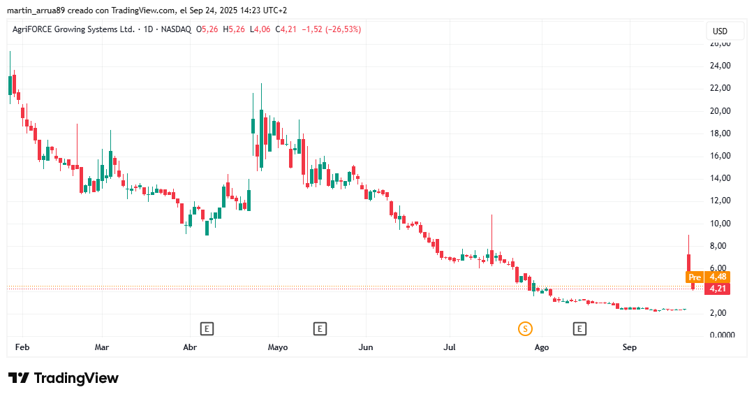 Tras el anuncio, la cotización de la acción bursátil AGRI pasó de 2,37 a 7,28 dólares, lo que representa una subida del 207%, tal como se observa en el siguiente gráfico provisto por TradingView: