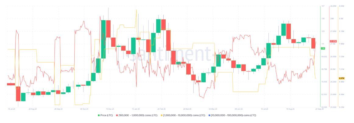 Los datos de distribución de la oferta de Santiment respaldan una perspectiva alcista para Litecoin. La métrica indica que las ballenas con entre 100.000 y 1 millón de tokens LTC(línea roja) han acumulado 660.000 tokens desde el 20 de septiembre. Durante el mismo período, las billeteras con entre 1 millón y 10 millones de tokens LTC (línea amarilla) han perdido 580.000 tokens.
