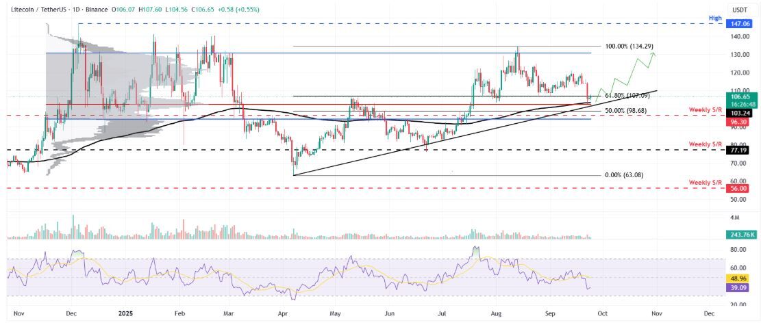 El precio de Litecoin sufrió un rechazo a principios de esta semana y cayó más del 7% el lunes, cerrando por debajo del nivel de retroceso de Fibonacci del 61.8% en 107.09 dólares (dibujado desde el mínimo de abril de 63.08 dólares hasta el máximo de agosto de 134.29 dólares). Sin embargo, LTC se recuperó ligeramente el martes tras volver a probar la media móvil exponencial (EMA) de 200 días en 103.24 dólares.
