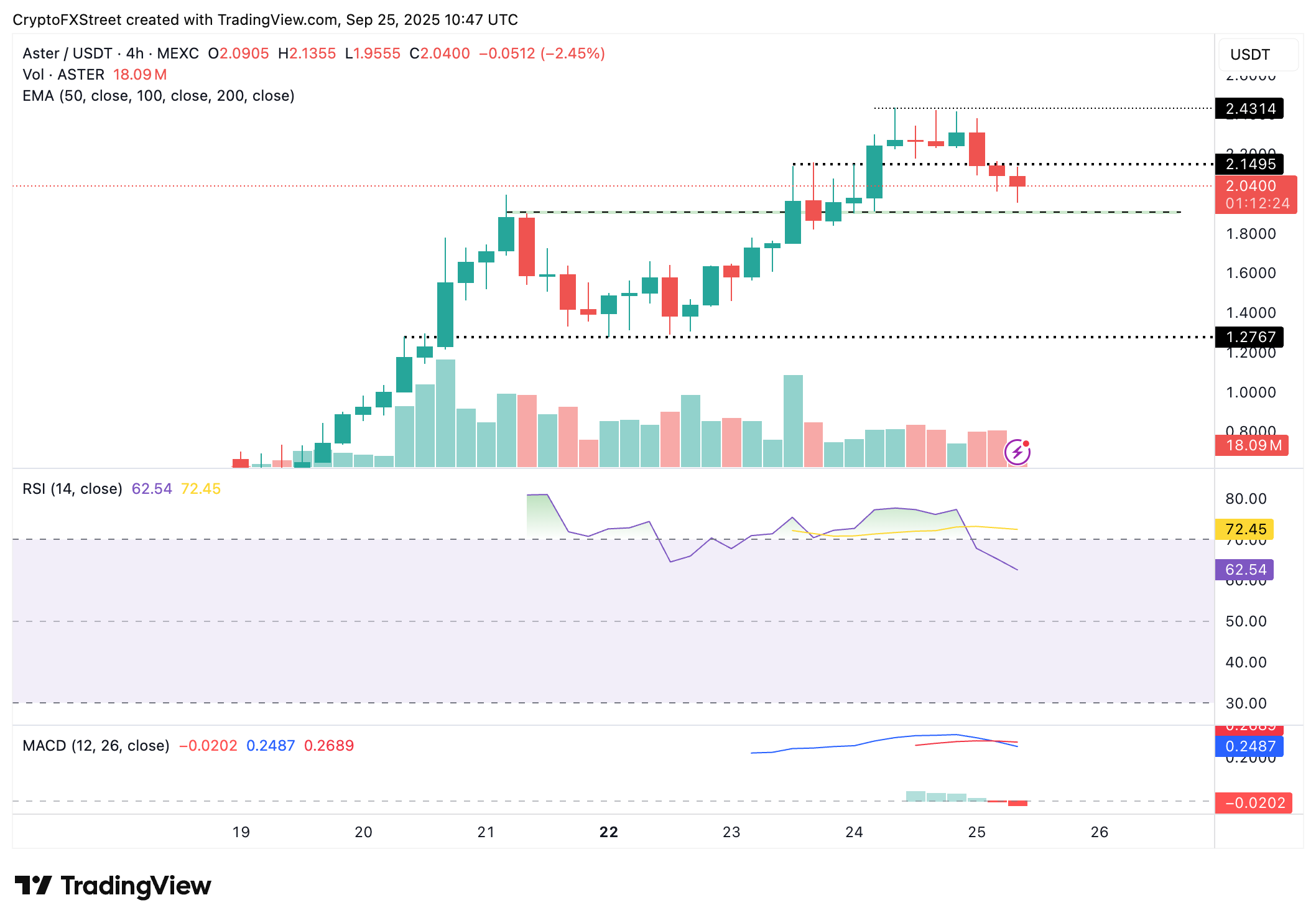 Aster (ASTER) se mantiene alrededor de 2.00$, con una caída de más del 10% en el momento de escribir este artículo el miércoles y alrededor del 17% desde su máximo histórico de 2.43$. El token respaldado por YZi Labs de Binance refleja el sentimiento negativo en el mercado de criptomonedas en general, que ha visto a Bitcoin (BTC), Ethereum (ETH) y Ripple (XRP) extender la corrección que comenzó a principios de semana.