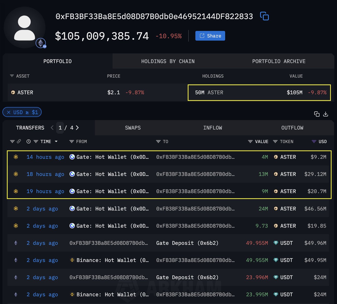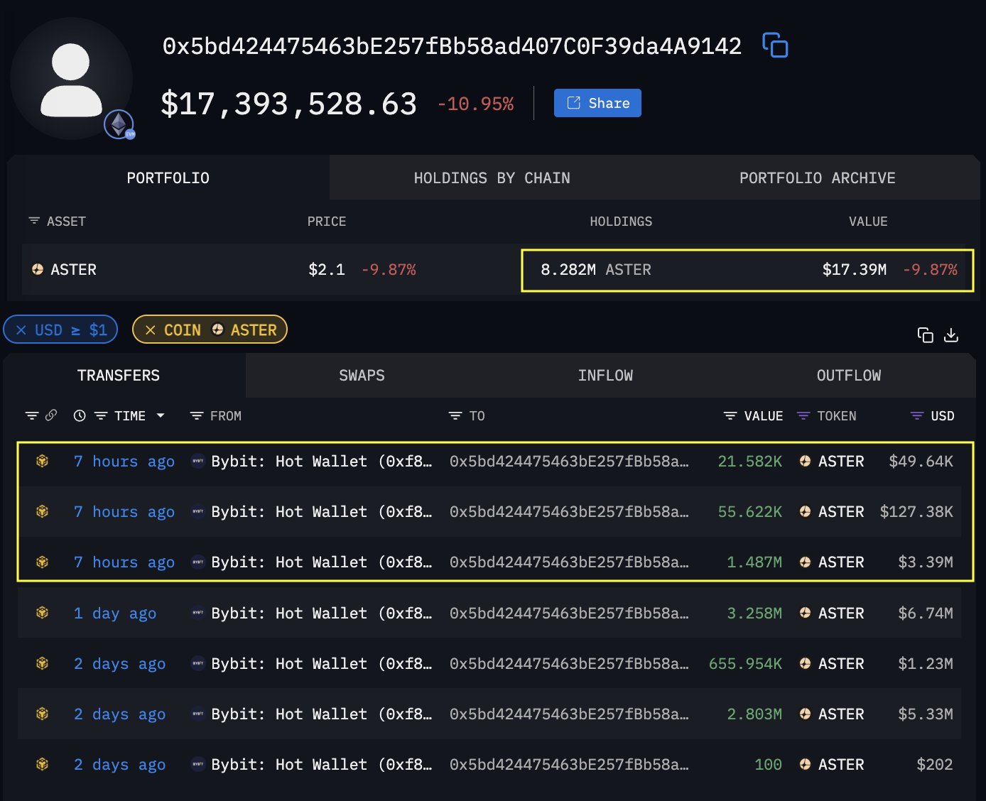 Otra billetera también ha comprado 1.56 millones de ASTER, valorados en aproximadamente 3.52 millones de dólares, del intercambio Bybit. Esta ballena actualmente posee 8.28 millones valorados en alrededor de 17.4 millones de dólares.