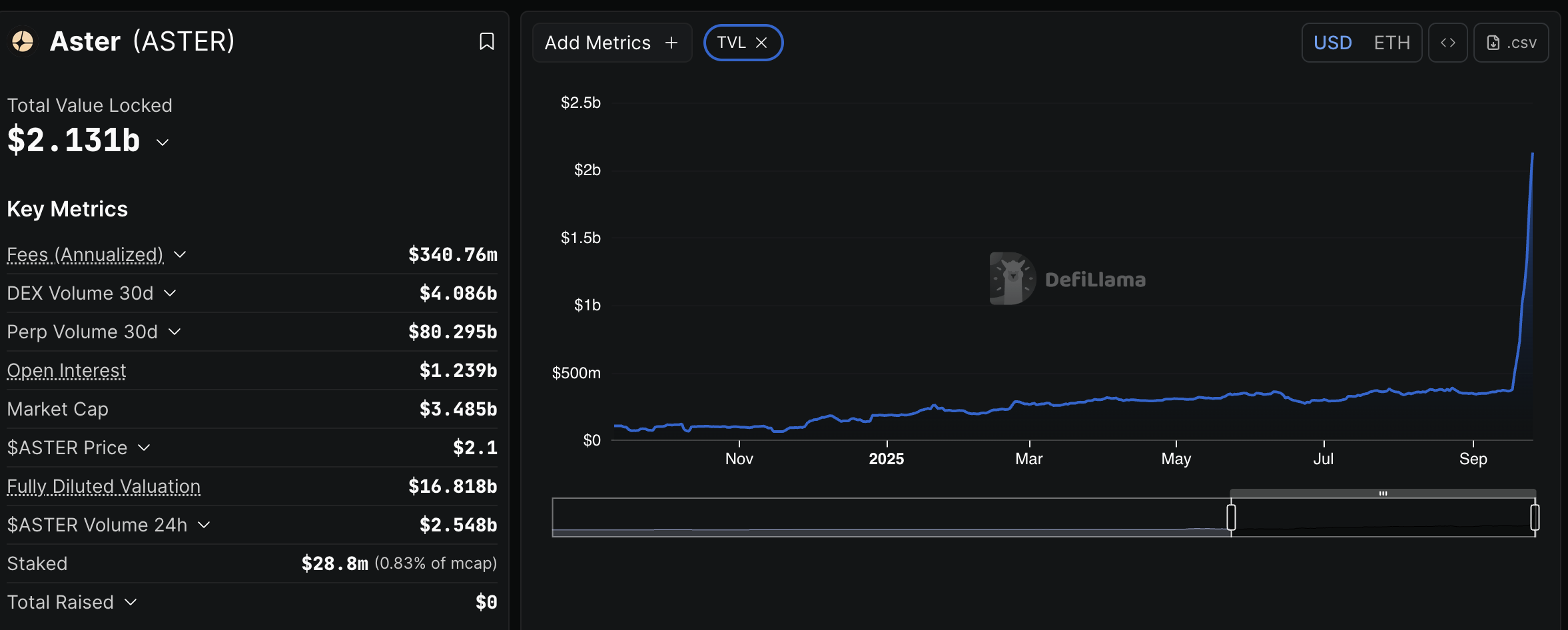 Según DefiLlama, el aumento en el interés y la confianza de los inversores en ASTER ha sido reflejado por el aumento constante en el Valor Total Bloqueado (TVL) del protocolo de Finanzas Descentralizadas (DeFi), que alcanzó un récord de 2.13 mil millones de dólares el jueves.