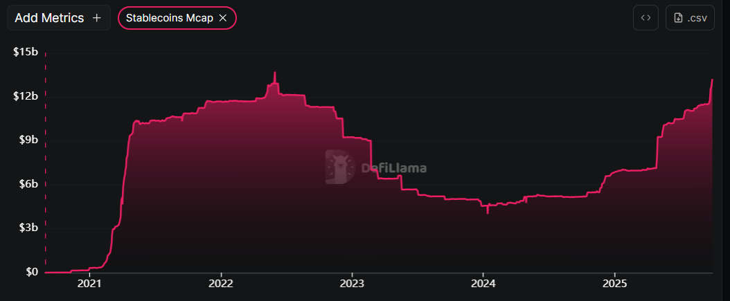 Los datos de DefiLlama muestran que la capitalización de mercado de la stablecoin BNB se sitúa actualmente en 13.22 mil millones de dólares, un nuevo máximo histórico, y ha aumentado de manera constante desde principios de 2025. Tal actividad de stablecoin y aumento de valor en el proyecto BNB sugieren una perspectiva alcista, ya que impulsa el uso de la red y puede atraer a más usuarios al ecosistema, impulsado por las Finanzas Descentralizadas (DeFi), monedas meme y casos de uso de pagos.