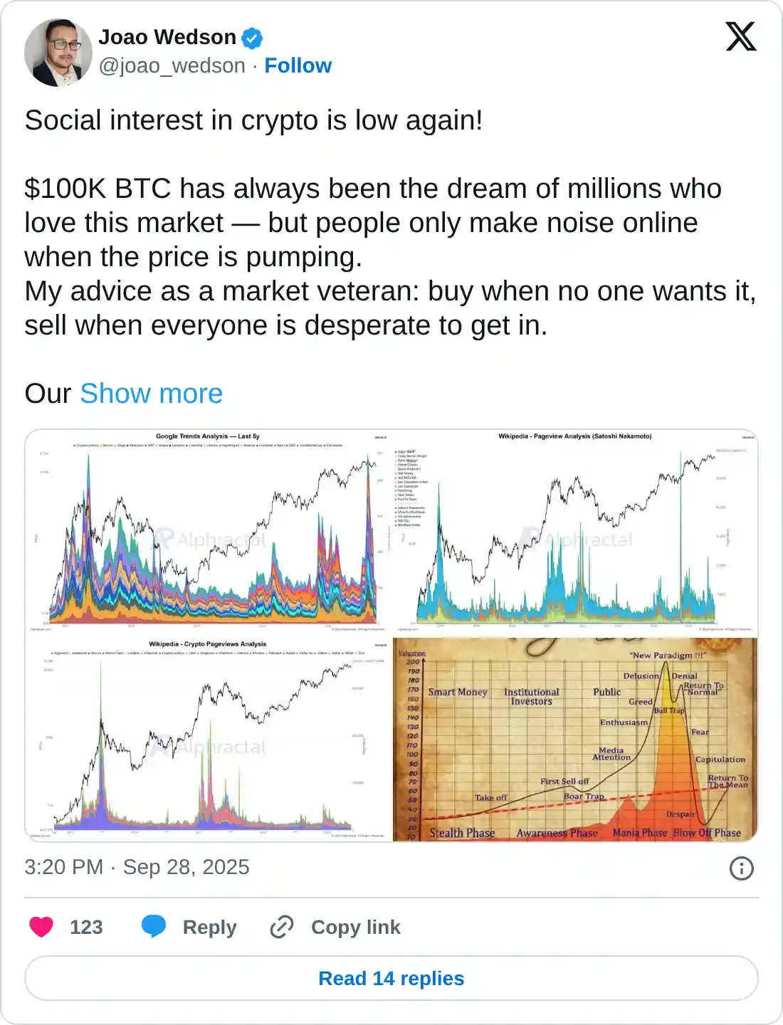 Validando el interés reducido, Joao Wedson, CEO de la plataforma de análisis en cadena Alphractal, compartió una disminución en el volumen de búsqueda de palabras clave relacionadas con criptomonedas en Google Trends, lo que sugiere que los inversores minoristas están a la espera.