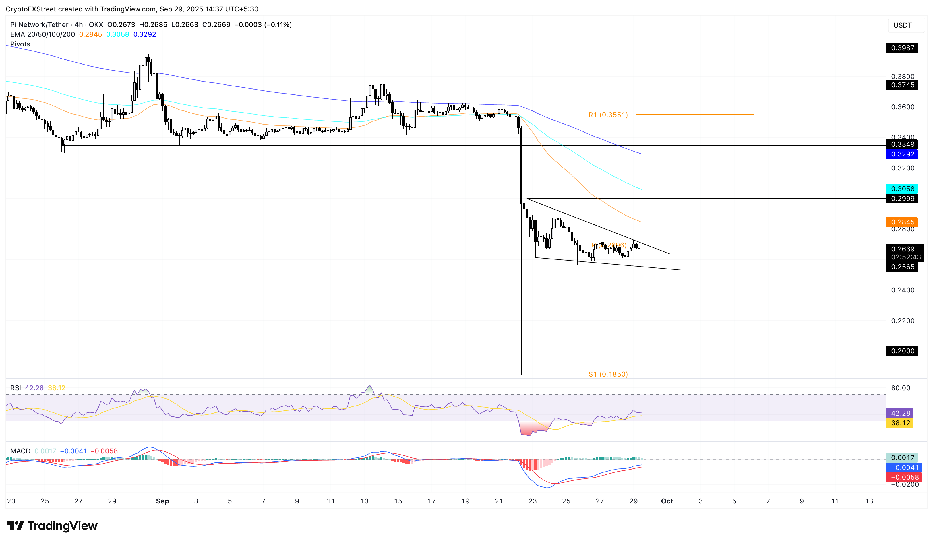 Pi Network se revierte desde el nivel del indicador de Punto Pivote en 0.2696$ el lunes, configurando un posible ciclo a la baja en un patrón de cuña descendente formado en el gráfico de 4 horas. Esta tendencia a la baja podría probar el mínimo del jueves en 0.2565$.