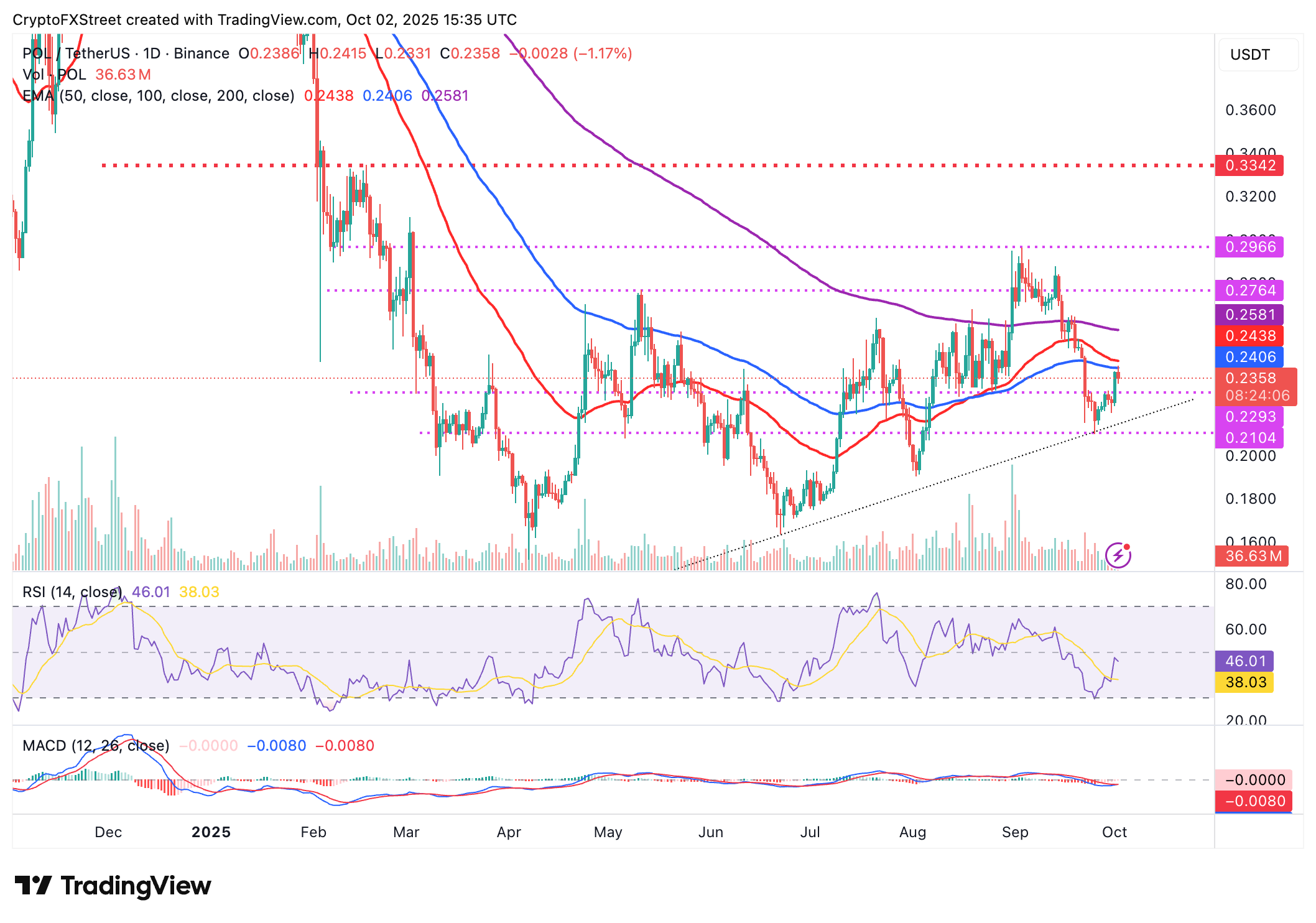 POL lucha por mantenerse por encima de las medias móviles clave, incluyendo la Media Móvil Exponencial (EMA) de 100 días en 0.2405$, la EMA de 50 días en 0.2438$ y la EMA de 200 días en 0.2581$.