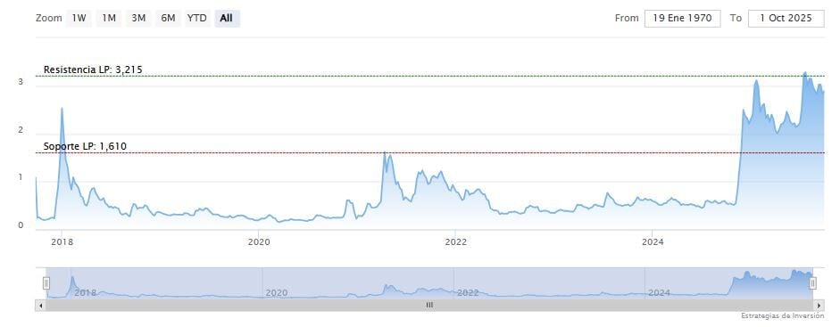 La resistencia a largo plazo se encuentra en los 3.21 dólares. Mientras, los indicadores de Ei se muestran mixtos.