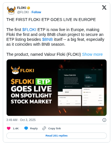 “FLOKI es la memecoin de BNB Chain más grande, más líquida, más mainstream y más fácilmente accesible. Acaba de obtener un ETP en un exchange de acciones regulado en Europa, brindando a instituciones y fondos una nueva forma de invertir durante el auge de BNB.”