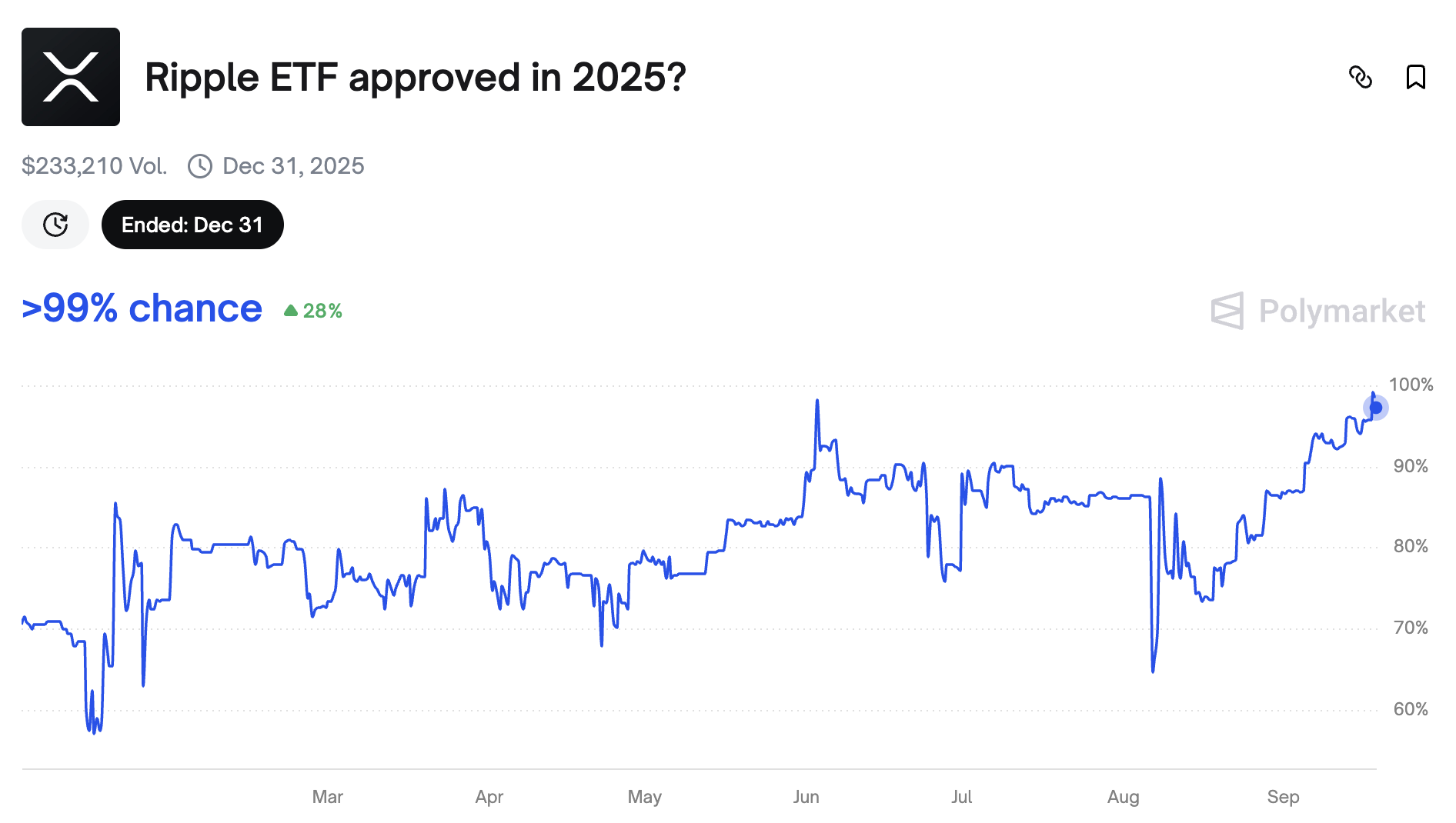 Actualmente, los participantes de Polymarket valoran la probabilidad de que la SEC apruebe un ETF de XRP al contado en más del 99%. Esta expectativa, junto con noticias positivas, podría desencadenar un aumento repentino de la valoración que favorezca a los partidarios de altcoin. Aunque se anticipa que la decisión de la SEC llegue en las próximas semanas, un cierre parcial del gobierno en los EE.UU. podría retrasar el proceso.