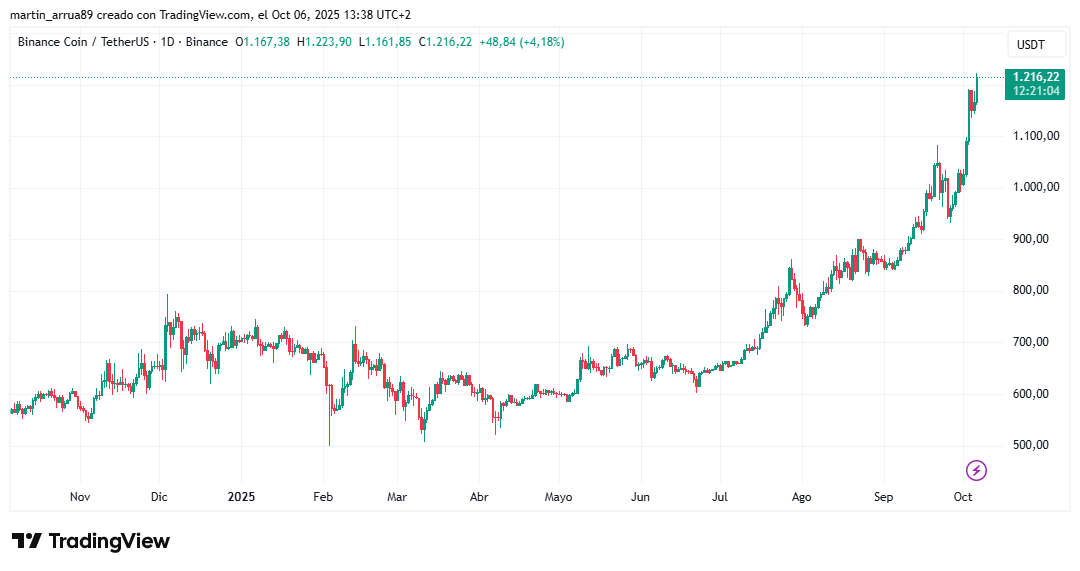 Al momento de la publicación de esta nota, la moneda nativa de la red BNB Smart Chain se negocia en 1.216 dólares, tal como se observa en el siguiente gráfico: