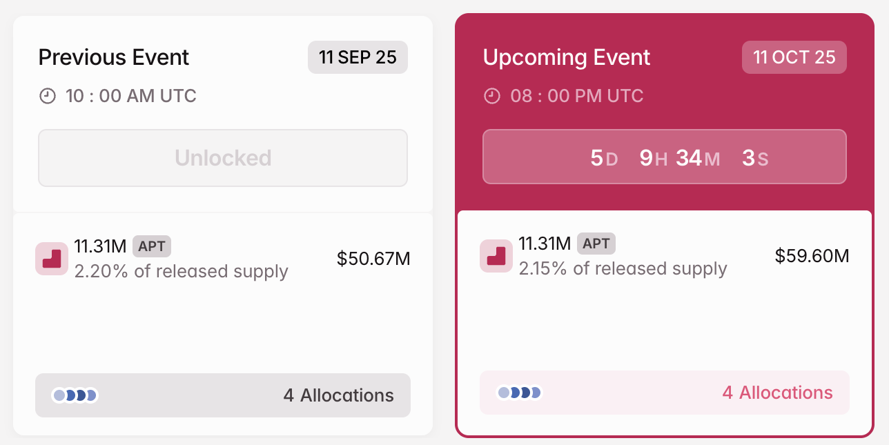 El equipo liberará 11,31 millones de tokens el 11 de octubre, siguiendo su patrón de desbloqueos mensuales. El suministro está valorado en 59.60 millones de dólares, representando el 2.15% del suministro liberado.