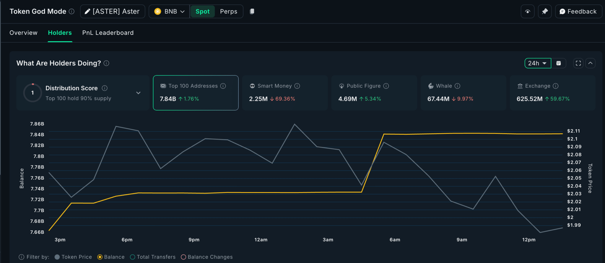Los datos on-chain muestran que las 100 carteras más grandes, denominadas «mega ballenas», poseen ahora 7,84 mil millones de ASTER, aproximadamente 264 millones de dólares al precio actual. La ligera caída a 2 dólares recientemente no ha desanimado a estas direcciones cripto que, por el contrario, fortalecieron sus posiciones en un 1,76 % en 24 horas, señal aparente de confianza.