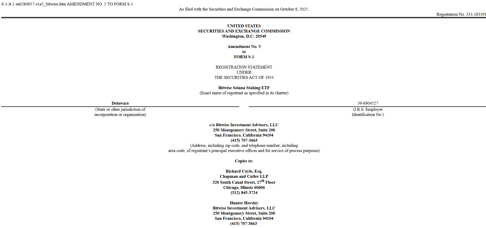 Bitwise, firma especializada en inversiones en activos digitales, actualizó ante la Comisión de Bolsa y Valores de Estados Unidos (SEC) los formularios correspondientes a su fondo cotizado en bolsa (ETF) basado en solana (SOL) para incluir el staking.