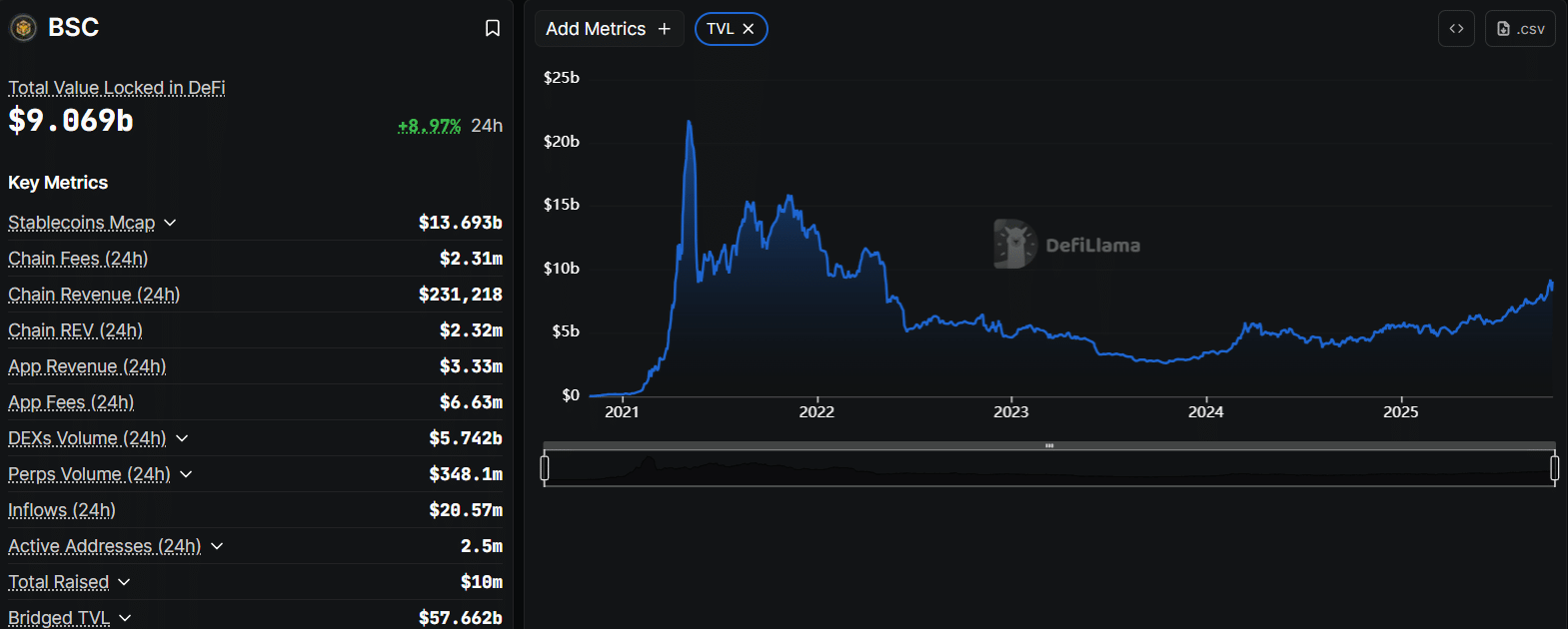 Datos de DeFiLlama muestran que la BNB Smart Chain (BSC) es la tercera blockchain más grande por valor total bloqueado (TVL), controlando $9.69 mil millones en activos. Solo en las últimas 24 horas, la red registró 2.52 millones de usuarios activos y procesó más de 20.7 millones de transacciones.