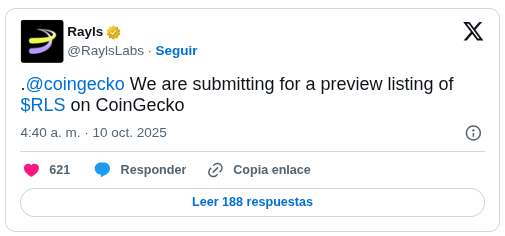 Las campañas comunitarias de Rayls están activas en Galxe, mientras que su listado preliminar en CoinGecko (publicado el 10 de octubre) insinúa una creciente anticipación para el lanzamiento del token.