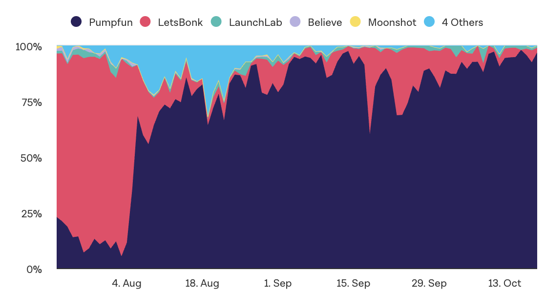 Incluso durante una desaceleración en la fiebre de los memecoins, Pump.fun se ha posicionado como una fuerza dominante en el mercado de lanzamiento de tokens al obtener un promedio de $1 millón en ingresos diarios. La plataforma ahora controla el 95% de las graduaciones diarias de tokens, lo que indica una ventaja significativa sobre competidores como LetsBonk, Believe y Moonshot, quienes brevemente desafiaron su supremacía durante los meses de verano.
