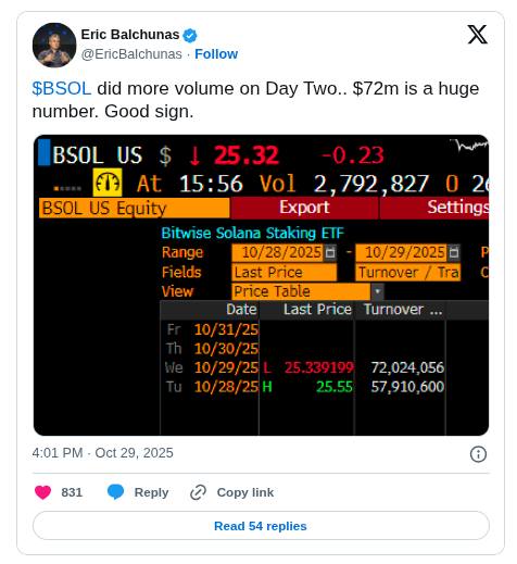 El 28 de octubre se lanzó el ETF de Solana (BSOL) de Bitwise. En su primer día, el producto registró 56 millones de dólares de volumen de trading, el más fuerte entre más de 850 nuevos ETF en 2025. Esto fue seguido por 72 millones de dólares el 29 de octubre, lo que señala un interés sostenido.