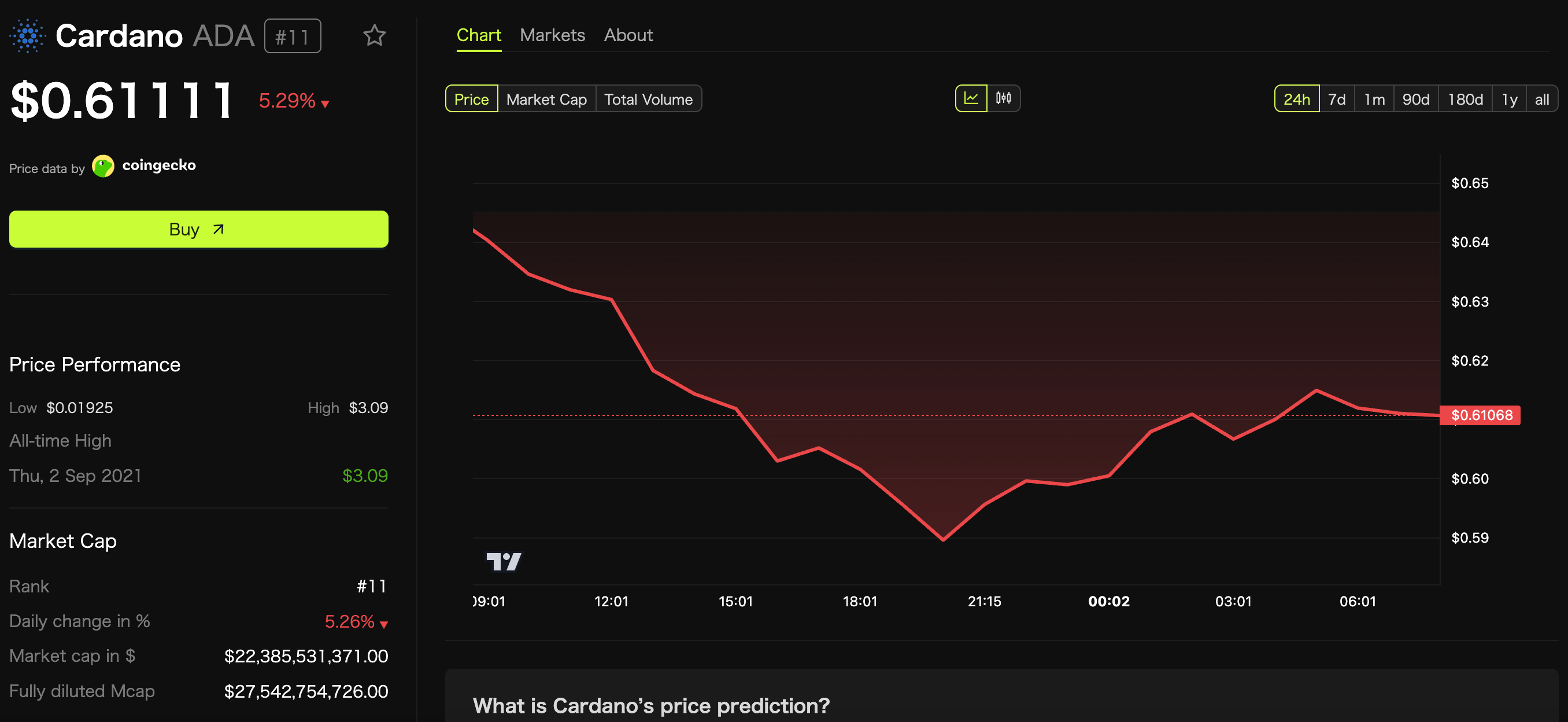 Tras la propuesta renovada de Hoskinson, las respuestas del mercado para Cardano (ADA) y Dogecoin (DOGE) han sido modestas. ADA cotiza actualmente alrededor de 0.61 dólares.