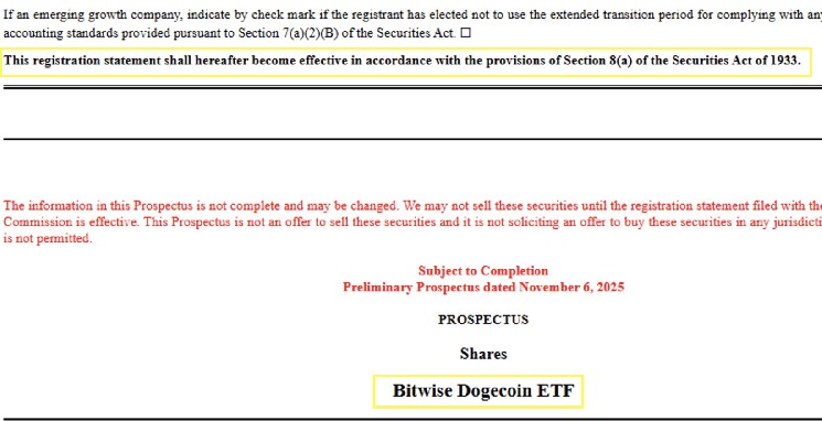Bitwise ha presentado oficialmente el formulario 8(a) bajo las leyes de valores de EE. UU. para listar un ETF de Dogecoin al contado. A diferencia del proceso de aprobación tradicional, el formulario 8(a) asegura que el ETF se vuelva efectivo automáticamente si la SEC no interfiere dentro de los 20 días estipulados. Balchunas enfatizó la rapidez del proceso, afirmando, “Bitwise planea activarlo dentro de 20 días con el movimiento 8(a).” Esta declaración indica que el primer ETF al contado centrado en Dogecoin está efectivamente en camino de comenzar a cotizar en el mercado estadounidense.