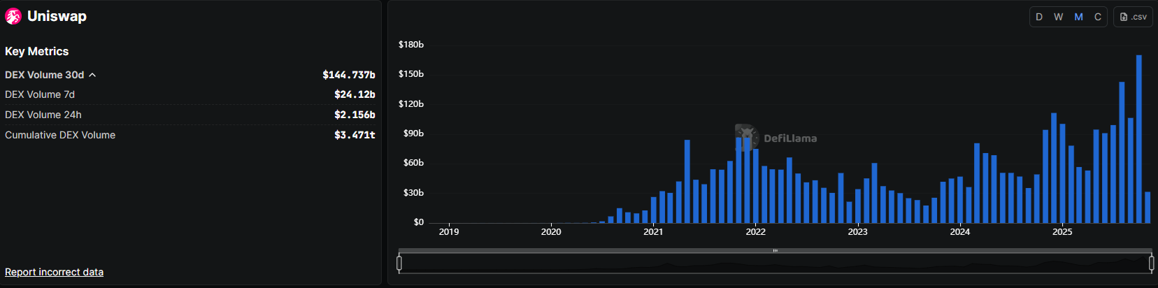 Como resultado, Uniswap generó comisiones récord de 275 millones de dólares en octubre, superando incluso el mercado alcista de 2021. El aumento de la actividad comercial y las mejoras en sus funcionalidades propiciaron una recuperación total de Uniswap tras el mercado bajista de 2022-2023.