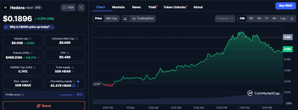 El token nativo de Hedera cotiza a 0,1896 dólares después de ganar más del 9% en las últimas 24 horas.