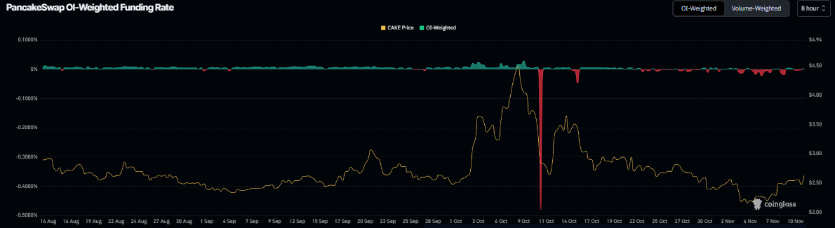 En el lado de los derivados, CAKE parece estar preparado para un repunte de recuperación, ya que los datos de la Tasa de Financiación Ponderada por OI de Coinglass muestran que el número de traders que apuestan a que el precio de CAKE caerá más es menor que aquellos que anticipan un aumento de precio.