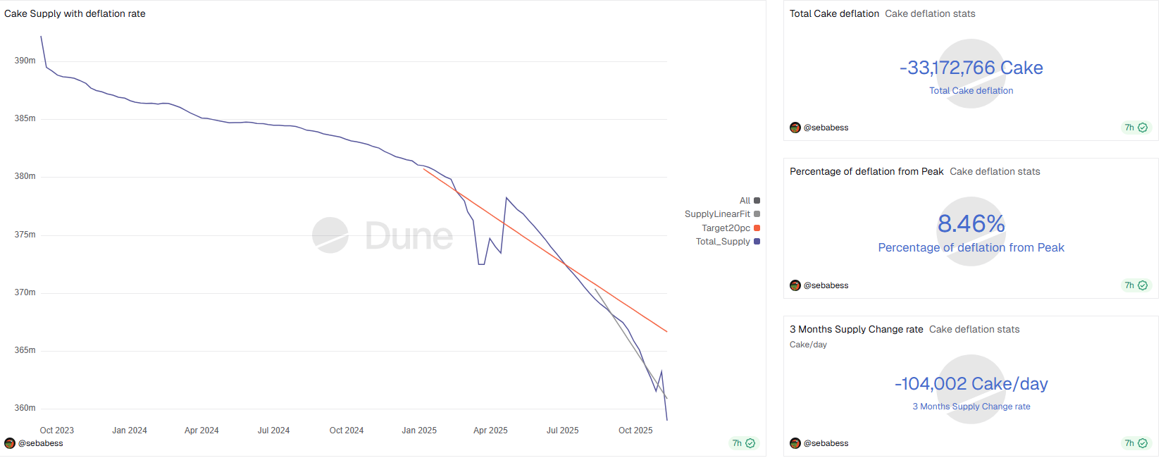 Los datos de Dune Analytics muestran que una quema deflacionaria semanal para el token nativo de PancakeSwap redujo la oferta total en 1.28 millones de tokens a 359 millones, superando las emisiones de tarifas de trading y mecanismos del protocolo. Esto indica que la tokenómica de CAKE está entrando en una fase más sostenible, con una contracción de la oferta que podría apoyar la presión alcista sobre los precios.