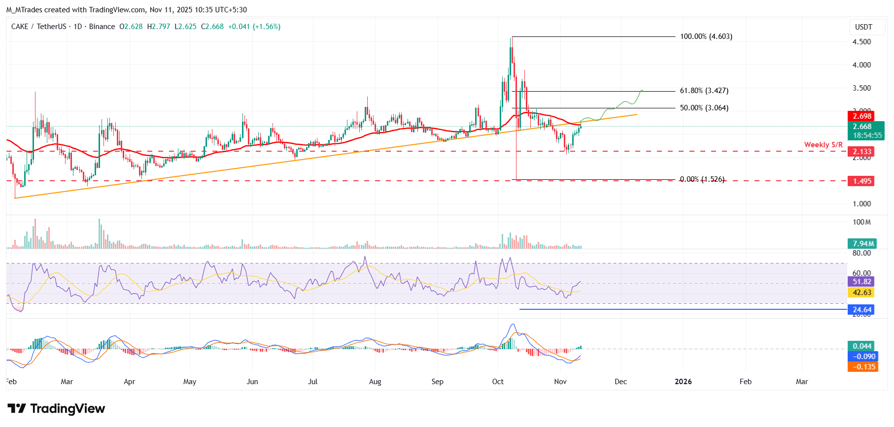El precio de PancakeSwap encontró soporte alrededor del nivel semanal en 2.13$ el 5 de noviembre y subió más del 16% hasta el lunes. Al momento de escribir el martes, CAKE continúa cotizando al alza, acercándose a su EMA de 50 días en 2.69$, que coincide aproximadamente con la línea de tendencia previamente rota.