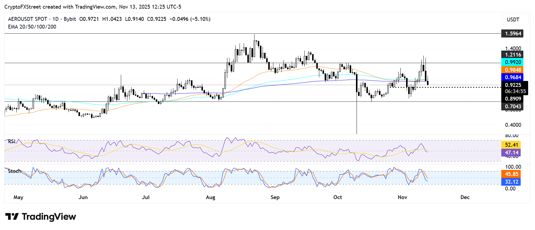AERO se acerca a un nivel de soporte a corto plazo cerca del nivel psicológico de 0.90$, del cual rebotó entre el 26 y el 28 de octubre. Un fallo en mantener este nivel podría enviar su precio hacia el nivel clave de 0.70$. Por el lado positivo, AERO debe moverse por encima de la confluencia de las EMAs para volver a probar la resistencia de 1.21$.