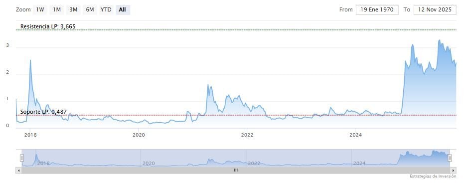 El soporte a mediano plazo se encuentra en los 1.40 dólares. Mientras, los indicadores de Ei se muestran mixtos.