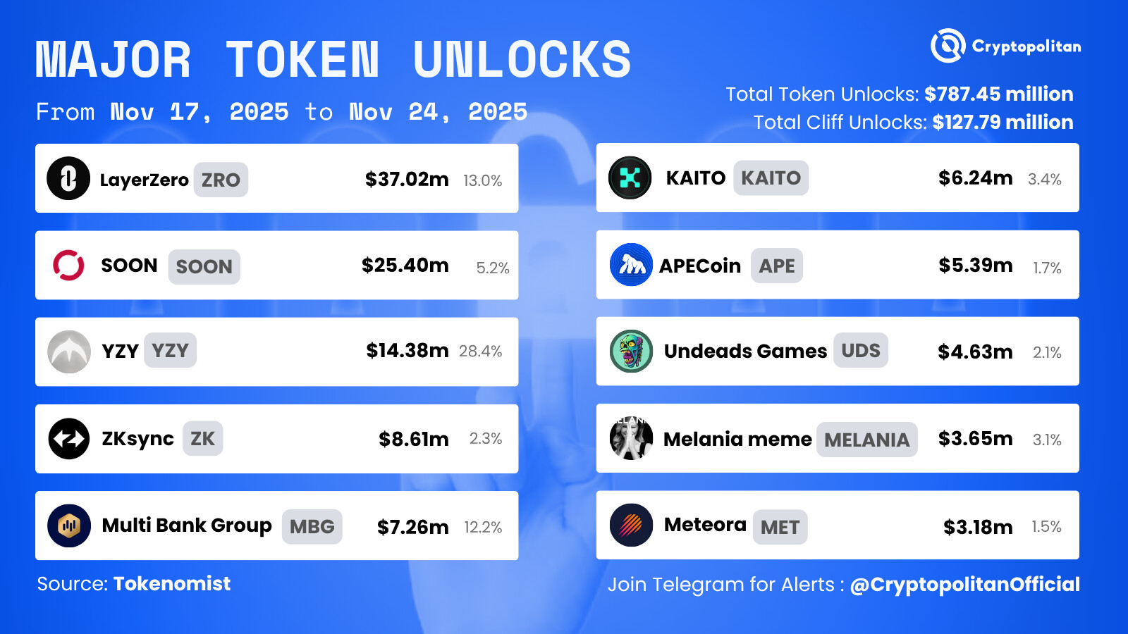 Se prevé la liberación de tokens por un total de más de 297 millones de dólares durante la semana que abarca del 17 al 24 de noviembre.