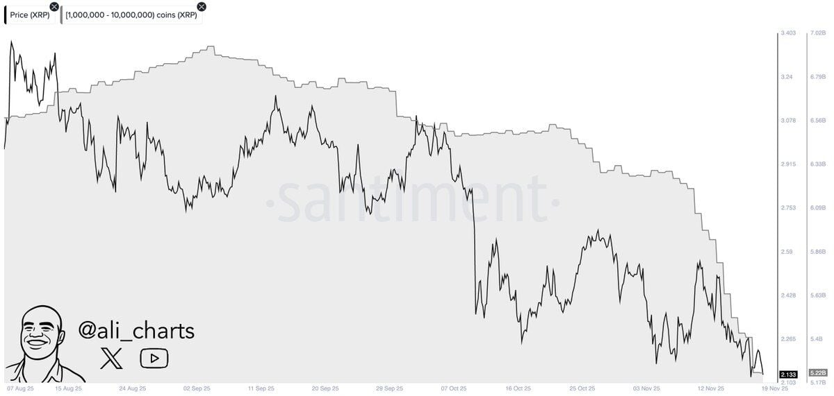 Según los datos de Santiment compartidos por el cripto analista Alí Martínez en X, en 48 horas, las billeteras de grandes inversores con entre 1.000.000 y 10.000.000 de XRP vendieron 200 millones de XRP, con un valor aproximado de 400 millones de dólares. En este contexto, los libros de órdenes de Binance y Coinbase muestran el mismo patrón: la nueva oferta entró al mercado más rápido de lo que la demanda pudo absorberla.