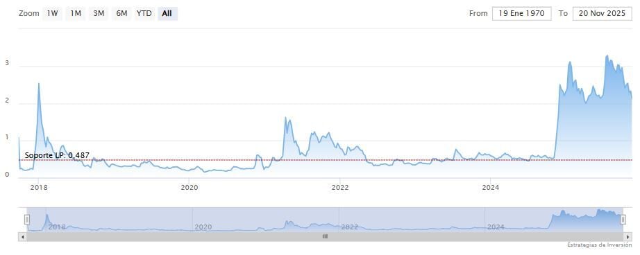 El soporte a mediano plazo se encuentra en los 1.40 dólares. Mientras, los indicadores de Ei se muestran prácticamente bajistas.