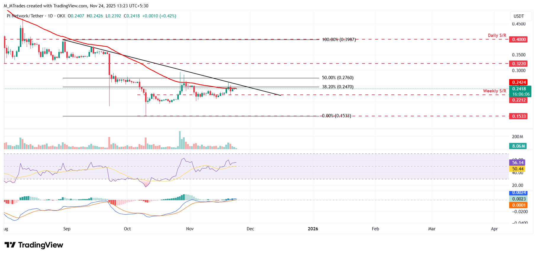 Pi Network cayó casi un 5% el viernes, volviendo a probar el nivel de soporte semanal en 0.221$, y recuperó la mayor parte de sus pérdidas durante el fin de semana. En el momento de escribir el lunes, se acerca a la media móvil exponencial (EMA) de 50 días en 0.242$. Esta EMA de 50 días coincide aproximadamente con el nivel de retroceso de Fibonacci del 38.2% en 0.247$ (dibujado desde el máximo del 30 de agosto de 0.398$ hasta el mínimo del 10 de octubre de 0.153$) y la línea de tendencia descendente, lo que la convierte en una zona de resistencia clave a observar.