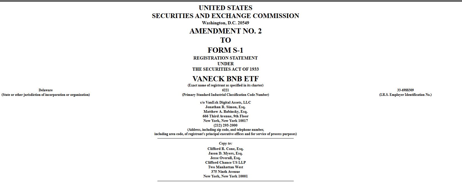 En la actualización del formulario S-1, se destaca que el VanEck BNB ETF cotizará en el Nasdaq con el ticker VBNB.