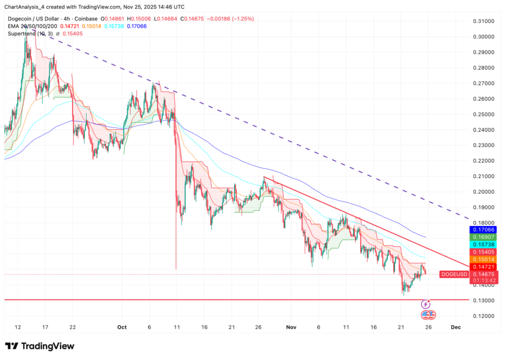 Dogecoin ha bajado un 3,81 % el martes, ya que la estructura general sigue atrapada en una tendencia bajista constante que se remonta a principios de octubre.