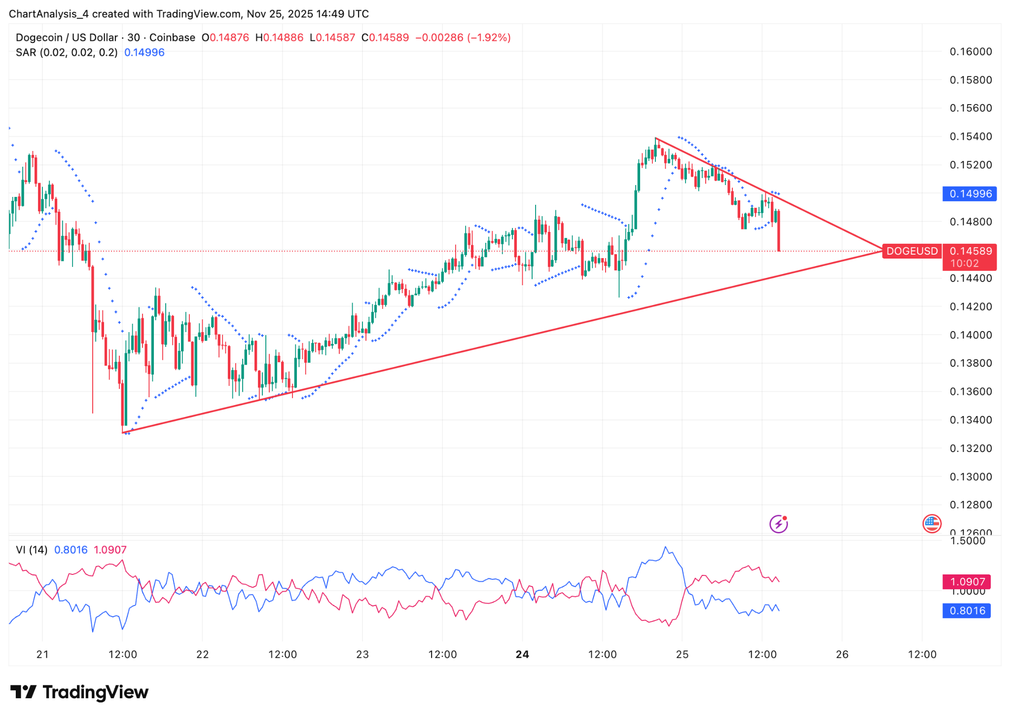 Se está formando un patrón de cuña entre el soporte intradía al alza cerca de 0,144 dólares y la resistencia a la baja cerca de 0,150 dólares.