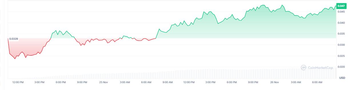 El token hizo su debut en el mercado el 24 de noviembre con una cotización de 0,02417 dólares. Con el correr de las horas, el precio fue subiendo y actualmente MON se negocia en 0,0474 dólares, lo que representa una subida del 85% desde su lanzamiento, tal como se ve en el siguiente gráfico: