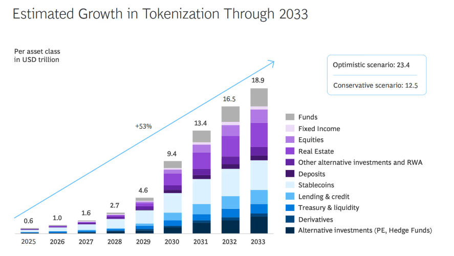 Como referencia, según proyecciones de BCG y Ripple, los activos tokenizados podrían convertirse en un mercado de $18 billones para el año 2033, a medida que más activos migren hacia la tecnología blockchain y el sector gane adopción.