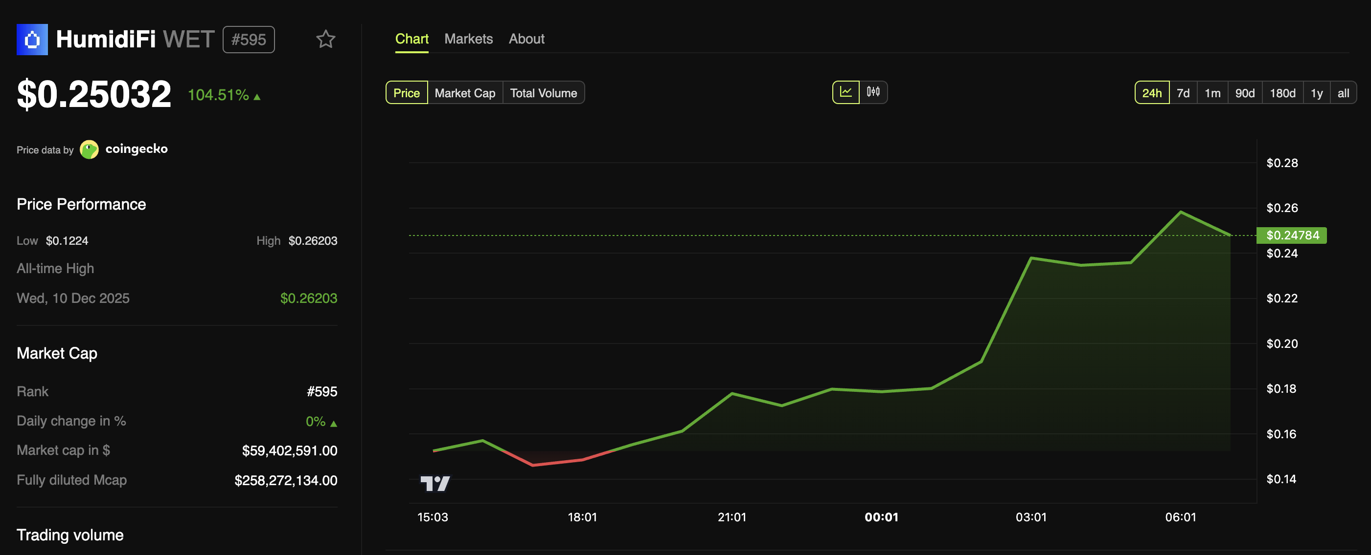 HumidiFi (WET) se ha convertido hoy en el mayor ganador diario en el mercado de criptomonedas, disparándose más del 100% en las últimas 24 horas.