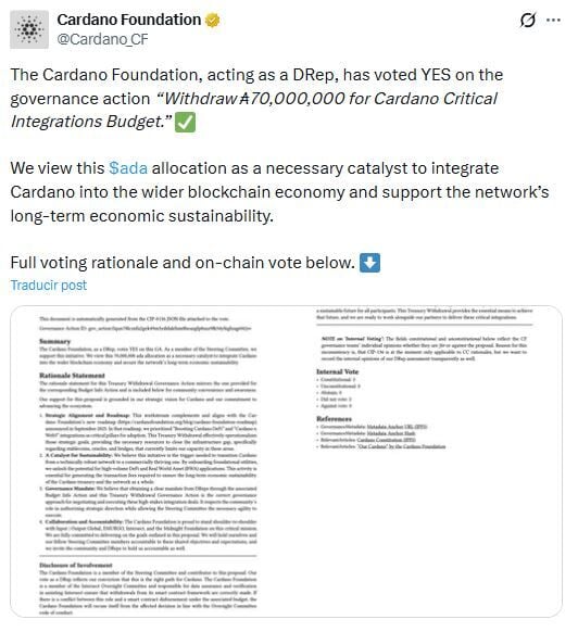 La Fundación Cardano (ADA) es la encargada de dirigir la gobernanza de la red. Recientemente, la misma ha votado a favor de retirar 70 millones de ADA del Presupuesto de Integraciones Críticas para integrar a la criptomoneda más profundamente en la economía blockchain y apoyar la sostenibilidad de la red a largo plazo. Pero esta medida trajo dudas ante la caída del 90% desde su máximo histórico, según Alexander Stefanov en Coindoo.