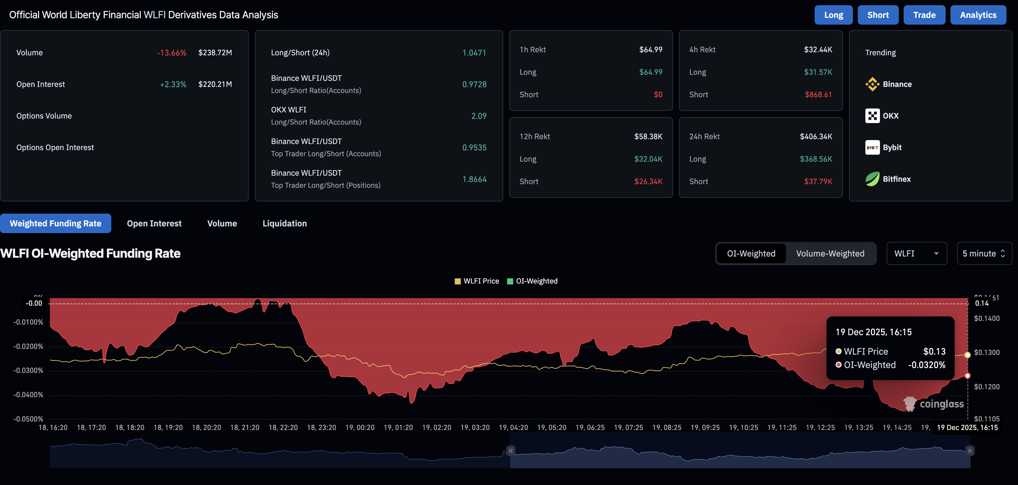 Los datos de CoinGlass muestran que el interés abierto (OI) de futuros WLFI se sitúa en 220.21 millones de dólares, un aumento del 2.33% en las últimas 24 horas, lo que sugiere un incremento tanto en posiciones largas como cortas. Sin embargo, el sentimiento bajista persiste, ya que la tasa de financiación ponderada por OI de -0.0320% indica que los bajistas están pagando una prima para mantener posiciones cortas.